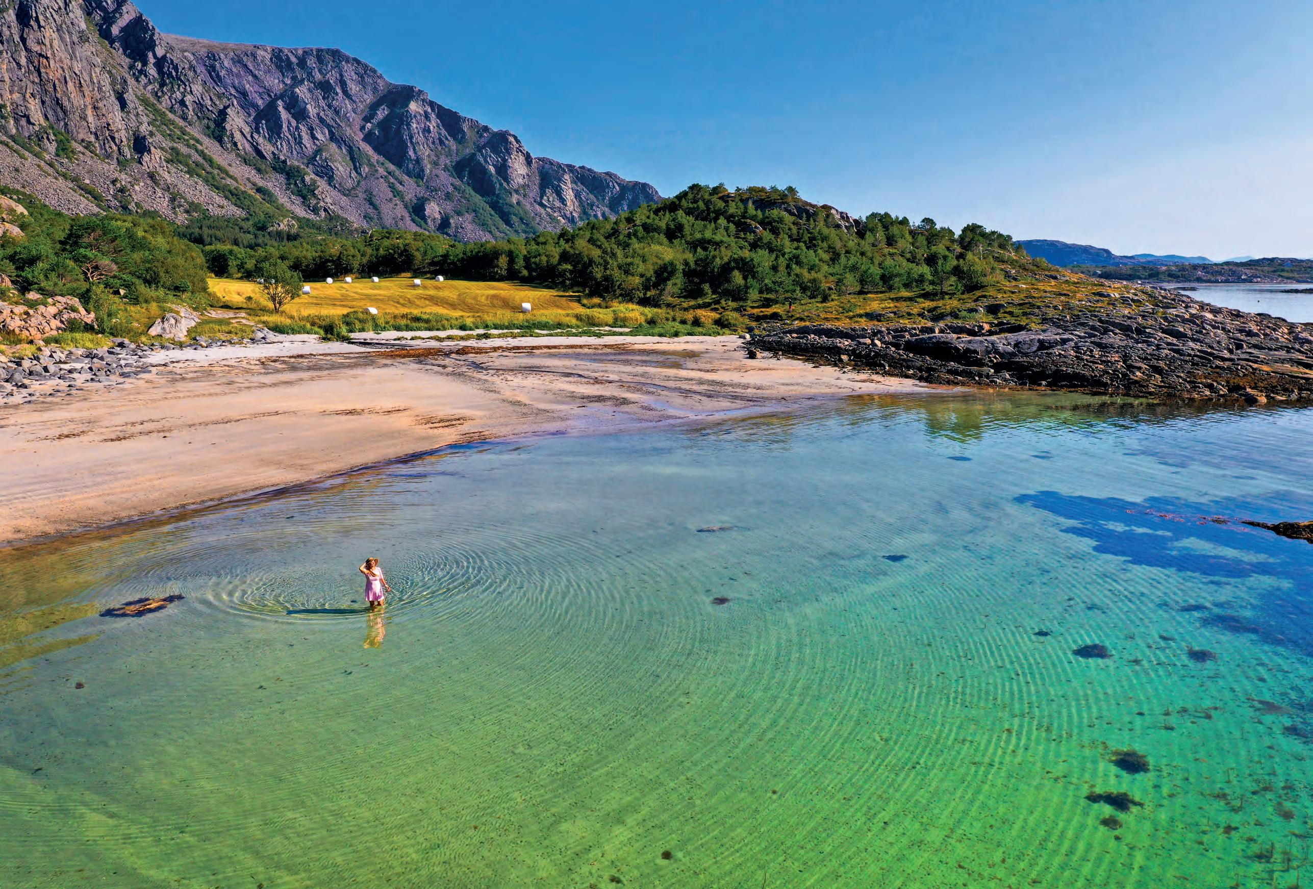4 BREIVIKA På yttersida av Dønna ligger en av Nordlands vakreste strender med plass til både telt og noen få campingbiler. Den måneformede Breivikstranda omkranses av turkist hav og grønne fjell.