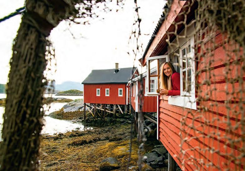 HØYT OG LAVT. Basecamp Vega er for øvrig et reisemål hvor det er gode muligheter for spreke aktiviteter. Trappene opp til Ravnfloget – hvor kloppbelagt sti med broer tar deg helt opp til siste oppstigning til høyeste punkt – er et must. Den som foretrekker en mer spennende utflukt, bør melde seg på klatretur i via ferrata-løype i fjellet, rett ved Ravnfloget. I begge tilfeller får du luftig utsikt over det storslåtte kystlandskapet. Det er fra fugleperspektiv 350 meter over havet at du virkelig får overblikk over øyrikets storhet, og skjønner at neste post på programmet skal gå til sjøs.