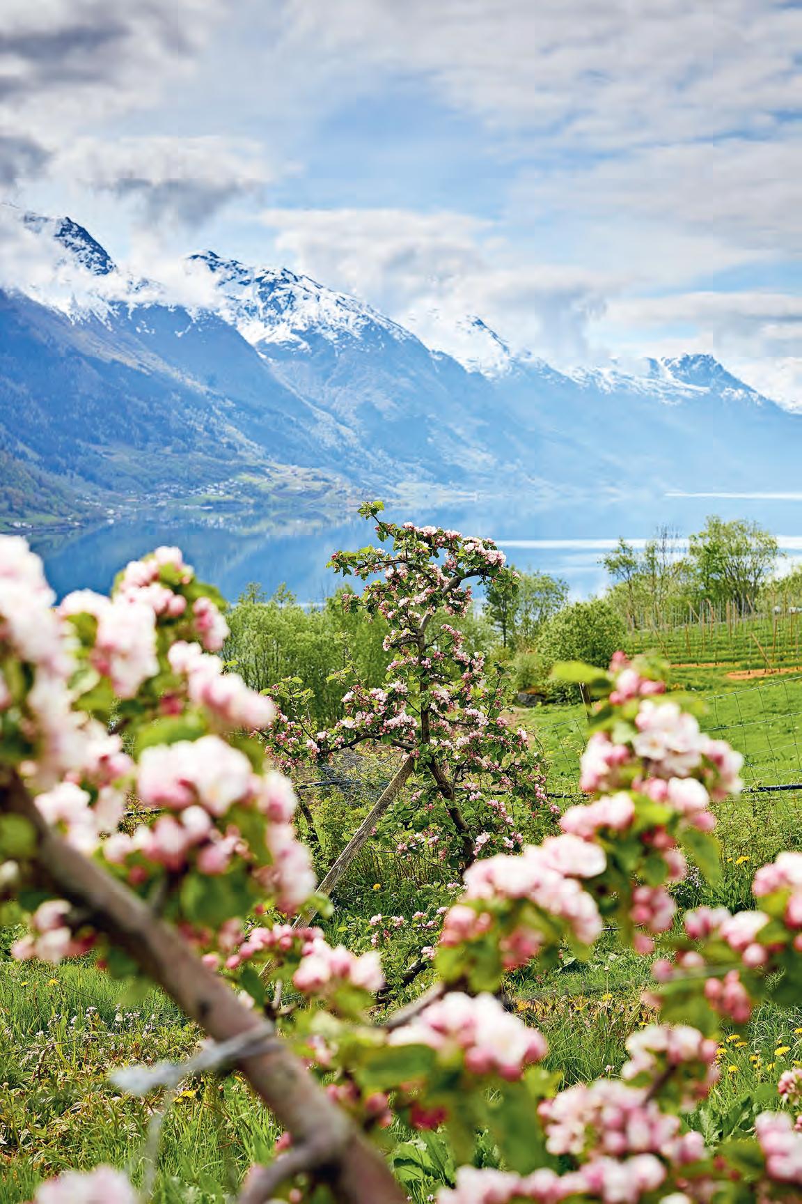 I Hardanger kan du slappe av i eplehagene og nyte den storslåtte utsikten. Foto: Øystein Haara