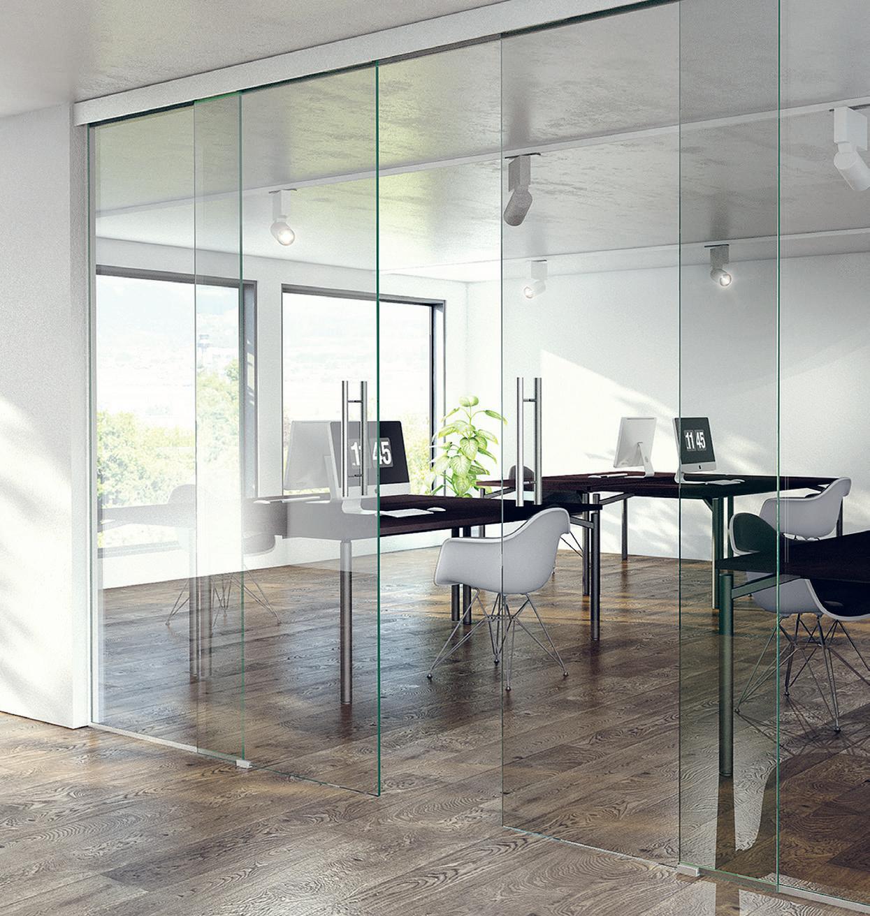SLIDO F -lasiliukuoven kiskoston pelkistetyn tyylikäs ulkonäkö kestää kovaakin käyttöä.