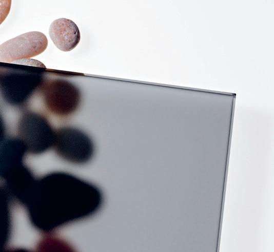 Etsatussa harmaassa satiinilasissa on puolihimmeä samettinen pinta. Lasin toinen puoli on lasimaisen sileä. Harmaa satiinilasi suodattaa valon hienovaraisesti läpi himmentäen ja pehmentäen näkymää viereiseen tilaan.