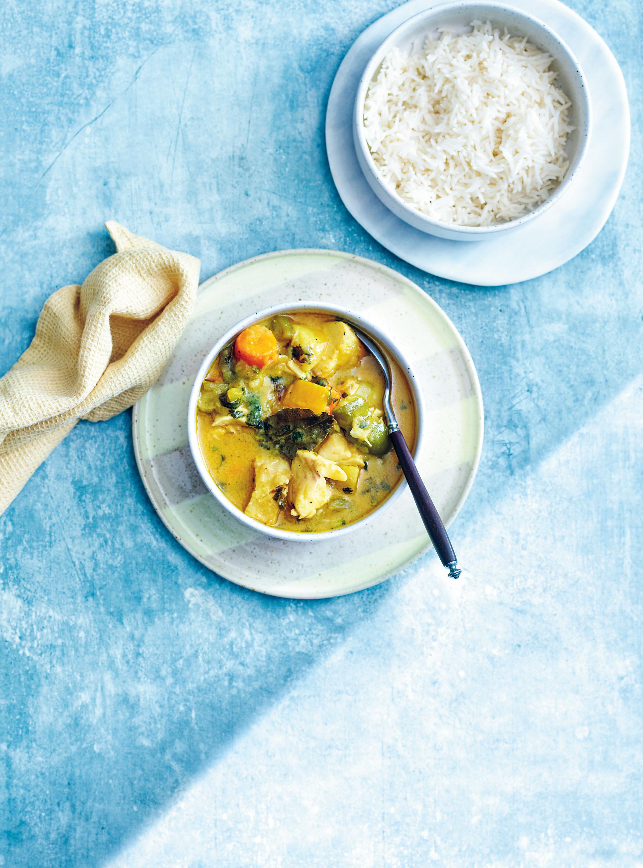 4. Tillsätt curryn och rör om. Lägg i morötter, potatis, lagerblad och smulad buljongtärning. Häll i kokosmjölk och vatten. Koka upp, sänk värmen och låt koka i 10 minuter.