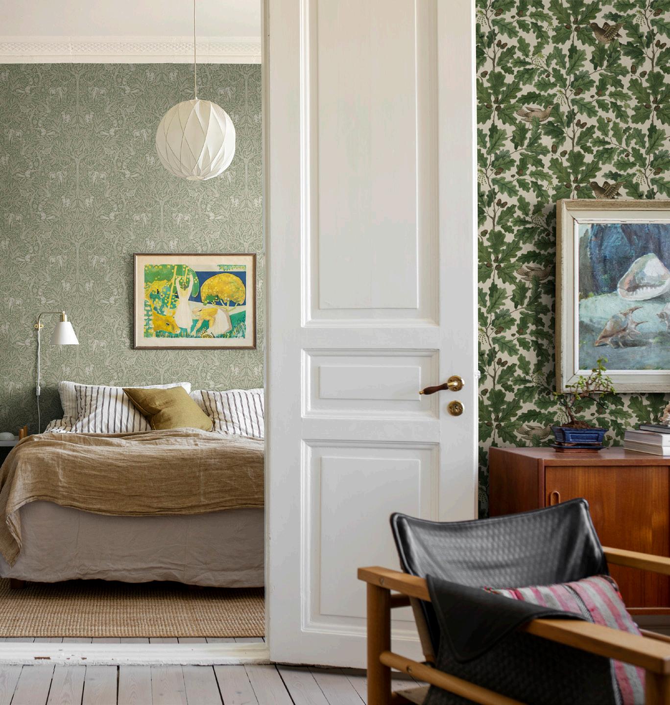 En röd tråd Låt en färg vandra mellan rummen –som det gröna här. In the oak gifter sig fint med Under the elder tree. 999 kr respektive 889 kr/rulle, båda från Boråstapeter.