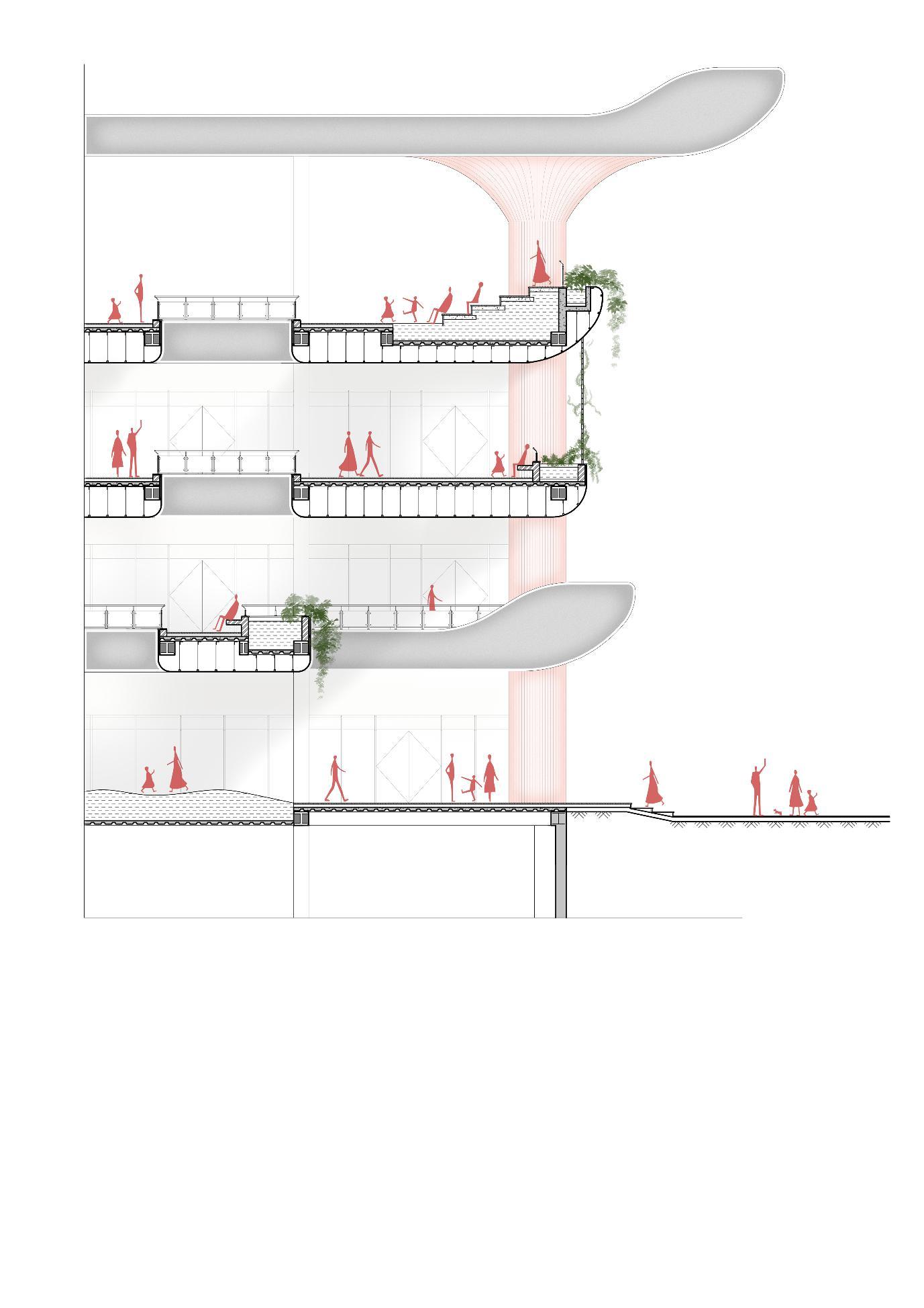 Designing for vertical Connections and interaction with seamless Plazas between floors at Retail and offices