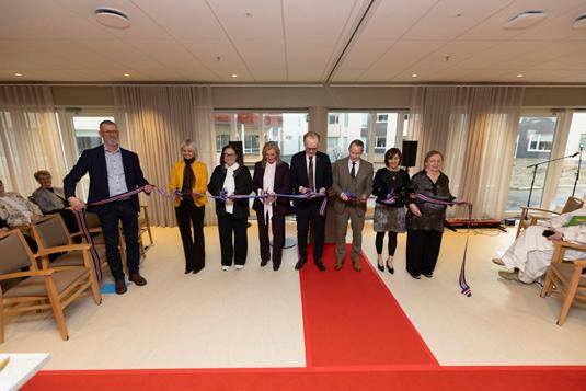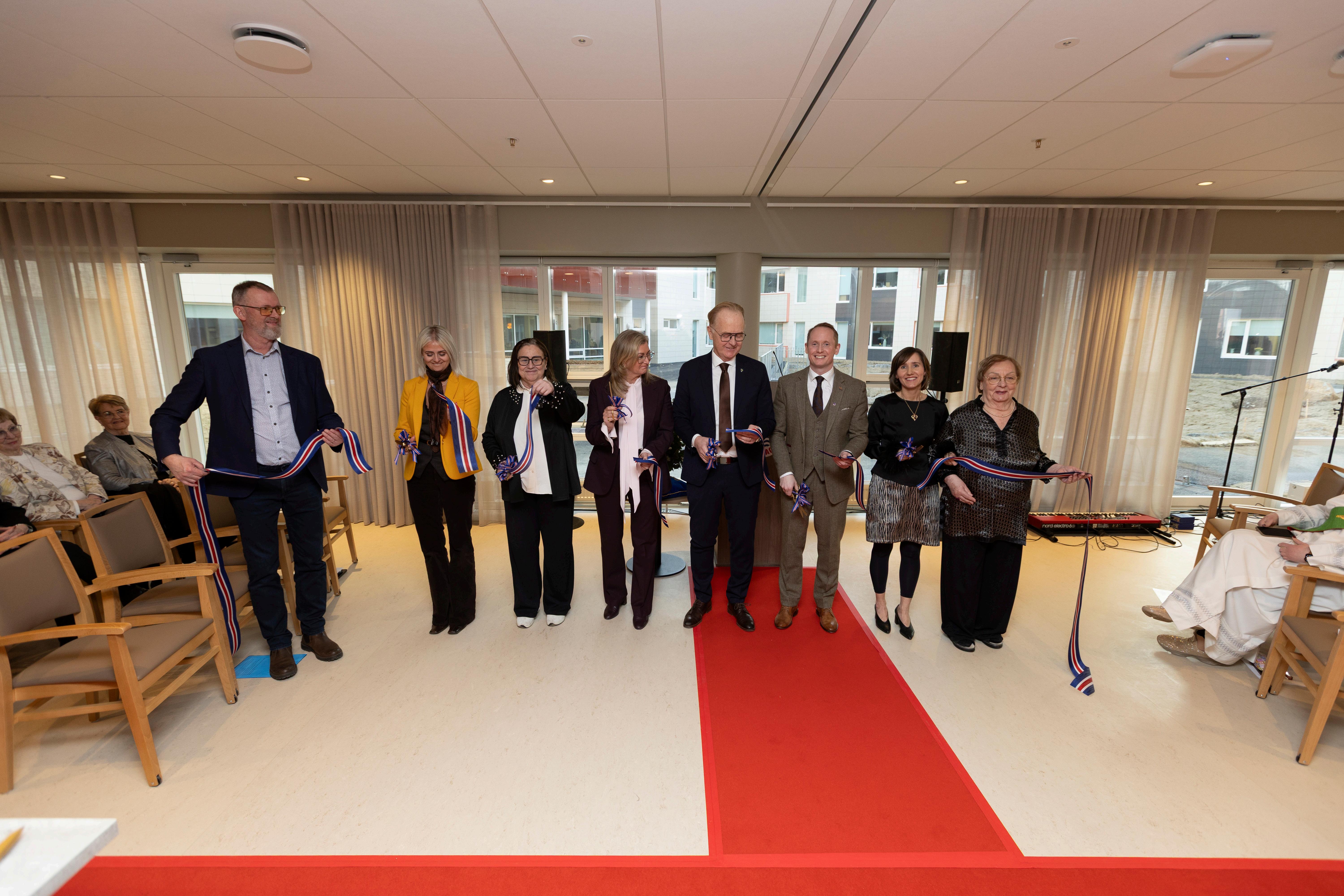 Frá borðaklippingunni, f.v.: Sigurður Hreinsson, verkefnisstjóri framkvæmdanna, María Fjóla Harðardóttir forstjóri Hrafnistu, Inga Sæland, fyrrum félags- og húsnæðismálaráðherra, Alma D. Möller, heilbrigðisráðherra, Kjartan Már Kjartansson, bæjarstjóri Reykjanesbæjar, Aríel Pétursson, formaður Sjómannadagsráðs, Þuríður Elísdóttir, forstöðumaður Hrafnistu á Nesvöllum og Sigríður Bjarnadóttir, íbúi í nýja húsnæðinu.