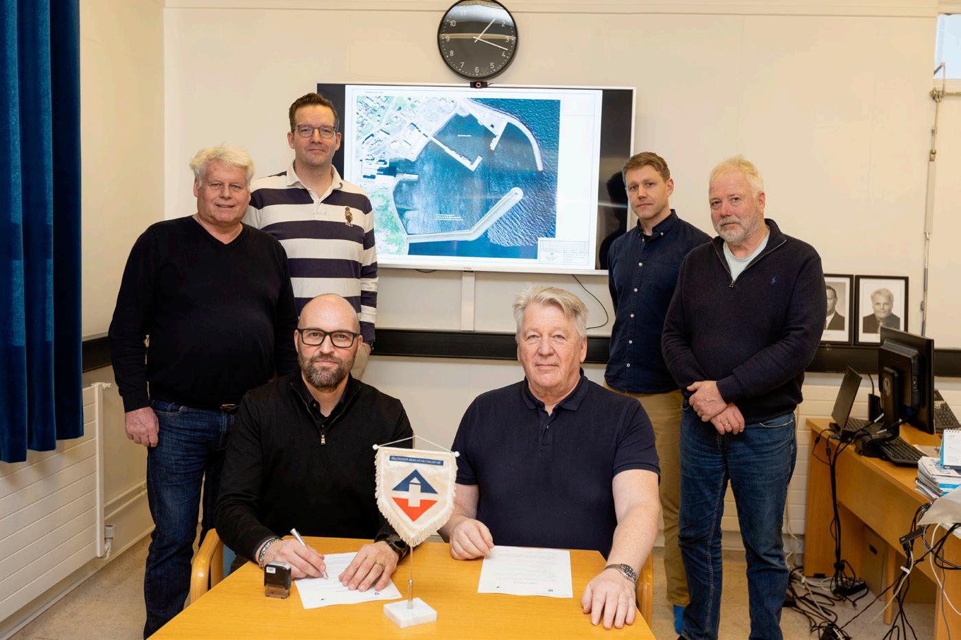 Frá undirskrift samnings: F.v.: Fremri röð: Þóroddur Ottesen Arnarsson forstjóri ÍAV og Halldór Karl Hermannsson hafnarstjóri. Aftari röð f.v.: Rúnar Ágúst
