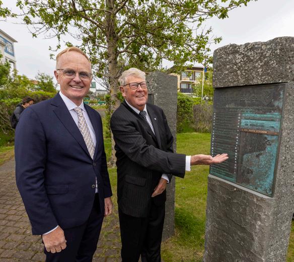 Friðrik Georgsson við stuðlabergið þar sem nafn Friðriks hefur nú verið skráð í hóp þeirra sem dregið hafa þjóðfánann að húni á 17. júní. VF/Hilmar Bragi