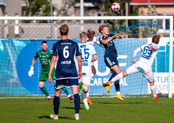 Dagur Ingi Valsson skallar boltann í leiknum gegn Fram. Boltinn hafnaði í marki Fram en Dagur var dæmdur brotlegur.