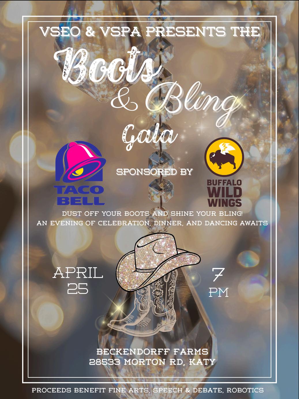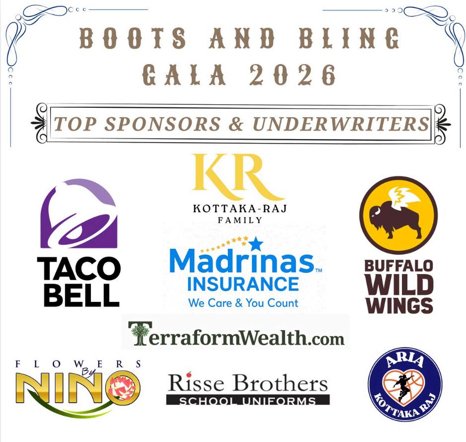 We extend our deepest gratitude to our generous sponsors, underwriters, wishlist sponsors, auction donors, and bidders; your support truly put the “BLING” in this year’s Boots & Bling Gala. It truly takes a "Village," and we are so grateful for your partnership in our mission to support this year’s gala recipients: Fine Arts, Speech and Debate, and Robotics/STEM. On behalf of the teacher leads and students in these programs, thank you for being a vital part of our community and for making this stellar evening possible.