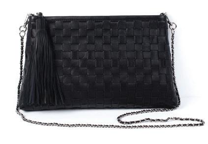 leather bag, leopard cowhide $299.99. Sportscraft Samara silk blouse $249.99 and Samara silk pant $299.99.