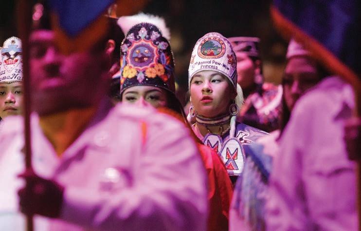 Pow wow dancers fill the arena during the Pechanga Pow Wow grand entry.