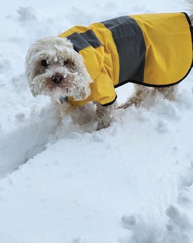 Patti Taylor’s pup Jake wears his cute snow suit in Anza.