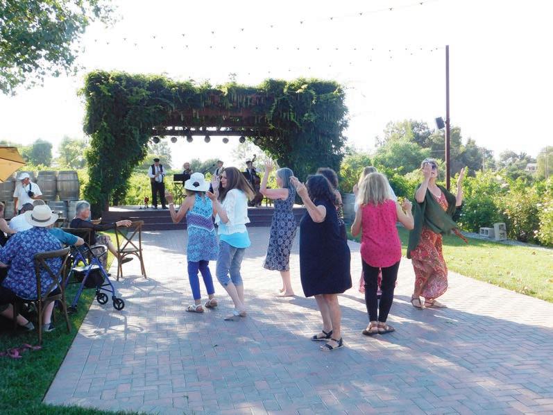 Supporters of the Holocaust Educational Memorial joyfully Jewish circle dance to the folk music of the Goldene Medina Klezmer Band at Lorimar Wineries Barrel Room.