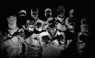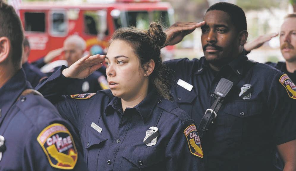 Cal Fire firefighters with black flags over their badges, salute the flag as the annual