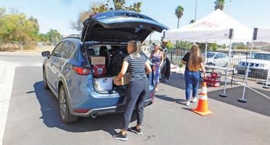 Volunteers from the Church of Jesus Christ of Latter-Day Saints load up Airport Fire victim Tara Sutton’s SUV with food, water, and cleaning supplies outside of the Lakeland Community Center in Lake Elsinore, where the county emergency help event was being held on Sept. 21. Valley News/Tony Ault photo