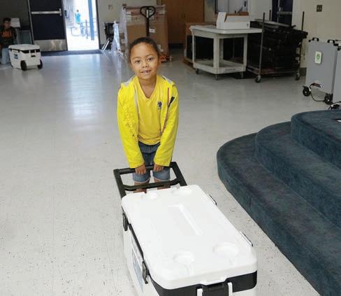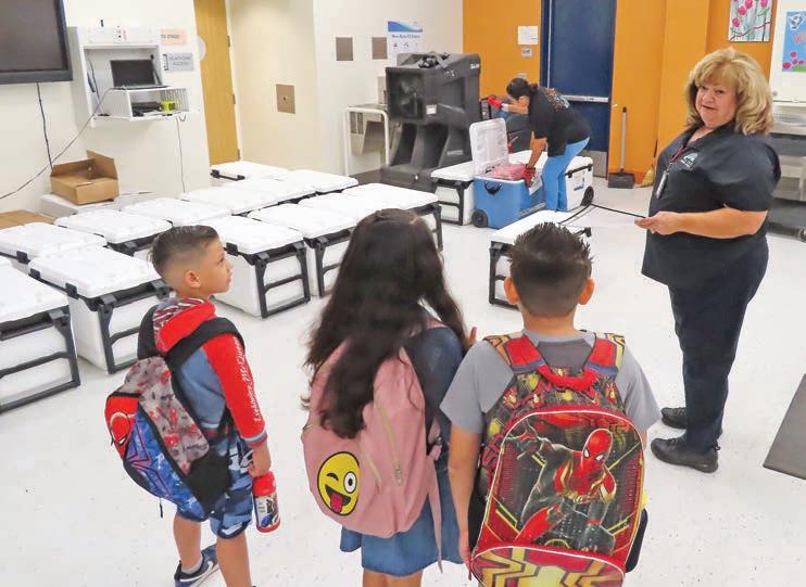 Shirley Chavez, supervisor of San Jacinto Unified School District Nutrition Services, chats with Park Hill Elementary School Breakfast Ambassadors as they prepare to take insulated coolers for “Breakfast in the Classroom.” Valley News/Diane A. Rhodes photo