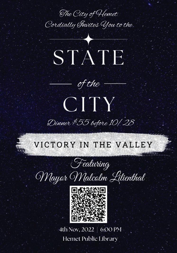 From that, Zimmerman brought up a video describing all the things that have been done economi cally that continue to improve the city’s economic growth. Each of the city council members on the video described what has been going on in their districts, each one showing continuing economic growth from new shopping centers to numerous new restaurants and other businesses. In addition to the restaurants, the new sports stadium at Mt. San Jacinto College’s Me nifee Valley campus and its underconstruction STEM building was praised by Councilmember Lesa Sobek in her district.