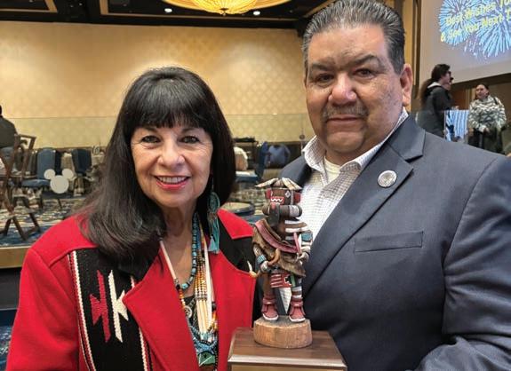 Soboba Tribal Chairman Isaiah Vivanco is congratulated by Yuhaaviatam of San Manuel Nation Chairwoman Lynn Valbuena after receiving the American Indian Chamber of Commerce of California’s Warrior Award.