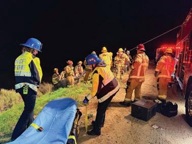 Photo: Cal Fire, Urban Search and Rescue, and NCFPD crews surround the patient and transfer him from the Stokes Basket to the ambulance after he plunged 200’ down the embankment. Valley News/Brian Briggs photo.