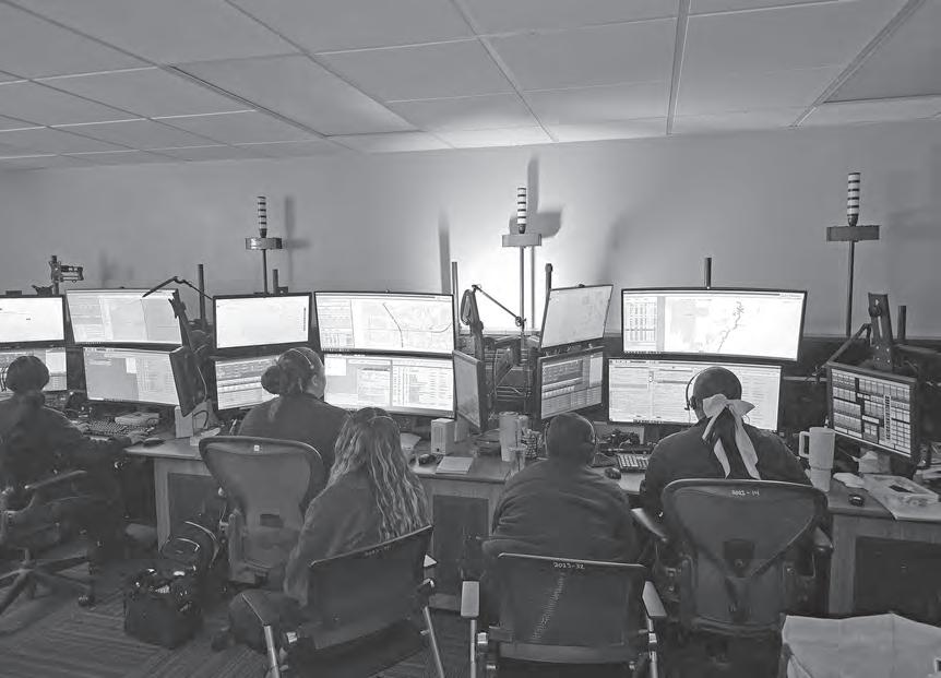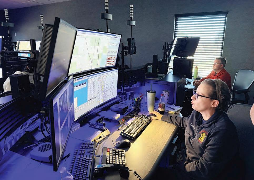 The new communications dispatch, call, and command center typically has 17 people working each shift. Pictured is Senior Fire Communications Dispatcher Jennifer Jones.