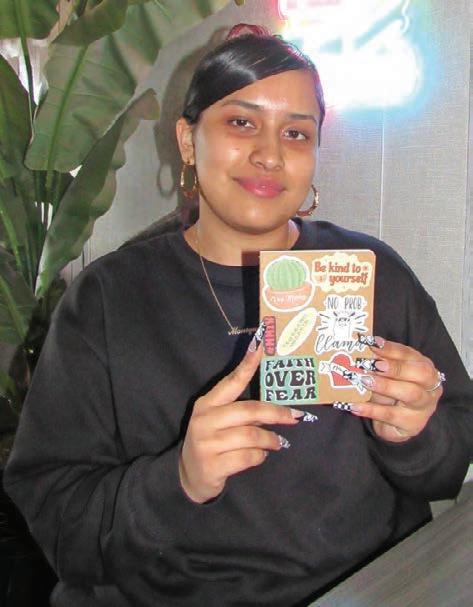 Monique Russell shows the cover of the pocket journal she decorated to celebrate kindness.