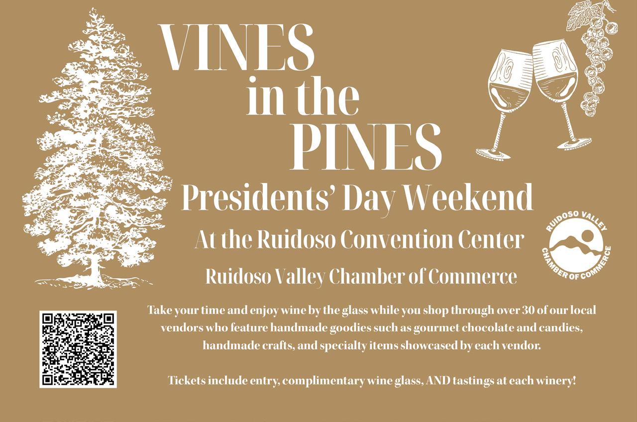 Valentine’s Day Weekend, we will be hosting our annual Vines in the Pines Art & Wine Festival, February 14 - 15, 2026, at the Ruidoso Convention Center. We will have New Mexico wineries present, as well as food and other boutique vendors, and live music. This is a great opportunity to indulge in some New Mexico wine tasting while enjoying local art, crafts, food, boutique vendors, and local brews available for those who aren’t wine drinkers. Bring your Valentine and enjoy fun for everyone! Tickets are available at HoldMyTicket.com or at the door.