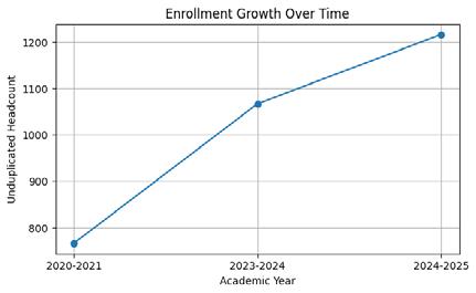 ENMU-Ruidoso released enrollment data on December 12, 2025, showing the fifth consecutive year of enrollment growth. Overall enrollment increased from 766 unduplicated headcount in 2020-2021 to 1,216 in 2024-2025, representing a 59% increase in unique students served. As well as a 14% enrollment growth in unduplicated headcount over the last year.