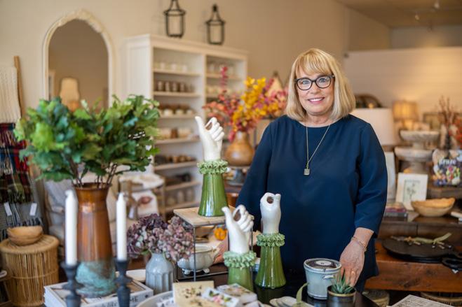 Home Again, the new store and workroom in the former Hayek’s Pharmacy building, specializes in custom uphol stery projects and unique housewares, gifts and home décor fabric sold by the yard. Where the Hayek’s candy counter and frozen-treat cooler once stood, custom ers now find cozy chairs and sofas, whimsical home goods and houseplants of many sizes, all against a backdrop of exposed brick, the original tile floor and bolts of colorful fabric.