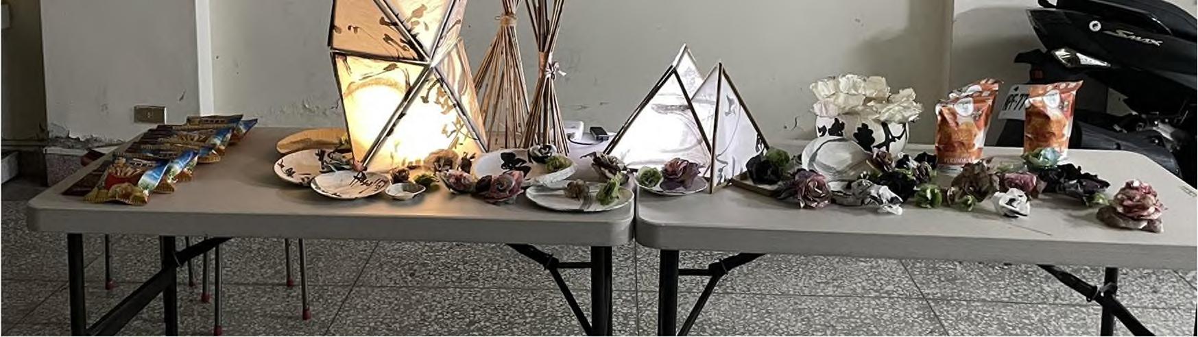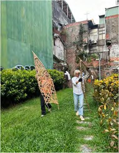 在竹編造景上方可以懸掛解說牌、藍染藝術作品或是結合樹葉的概念,如運用回收纖維進行更多的創作、 家庭廢紙打碎成紙漿、物資再生利用等