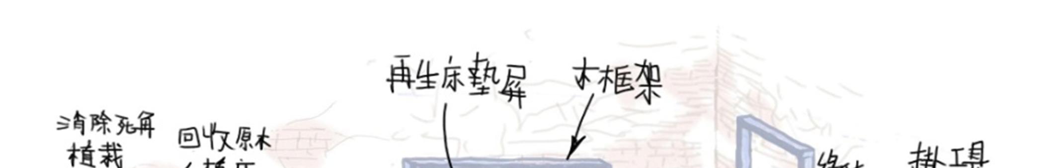 ● 繩攀上牆修除附生榕樹,枝葉碎化循環作為植栽床基底。