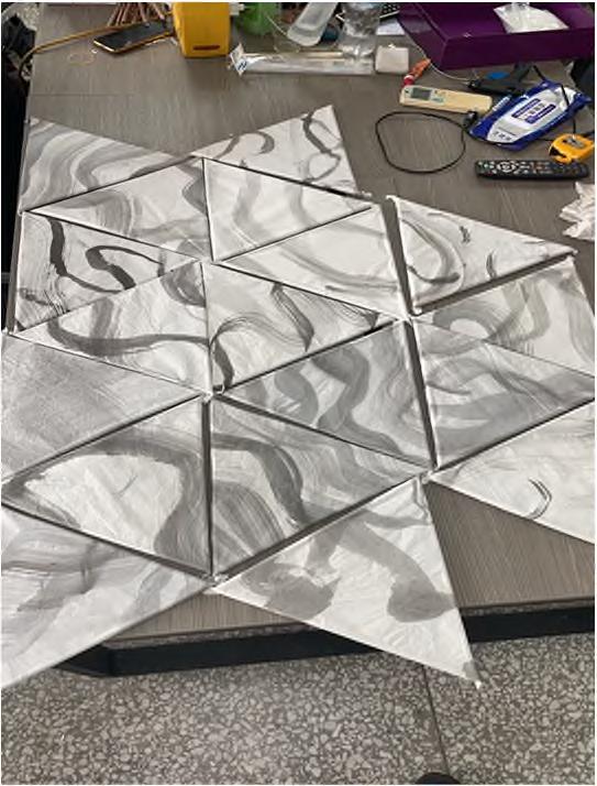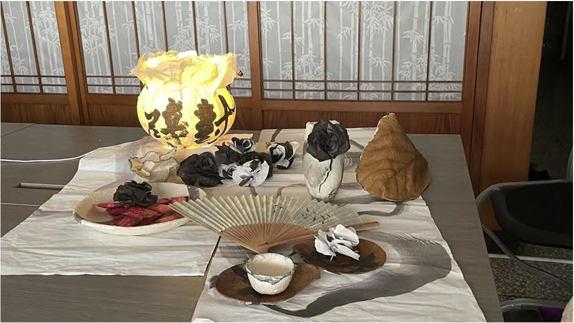 因此我們以茶席為概念想像,將使用過的棉紙,運用裱畫技巧,創作燈罩。