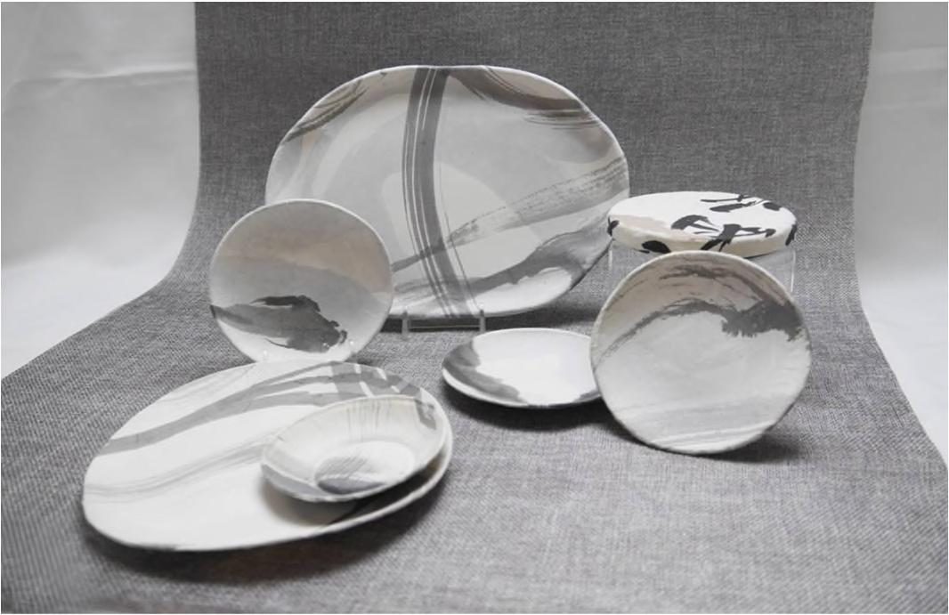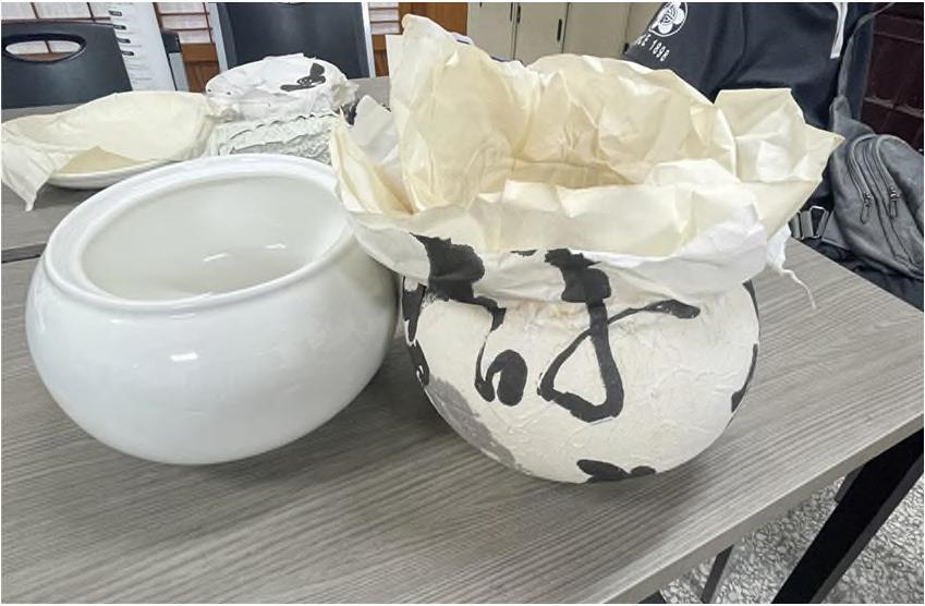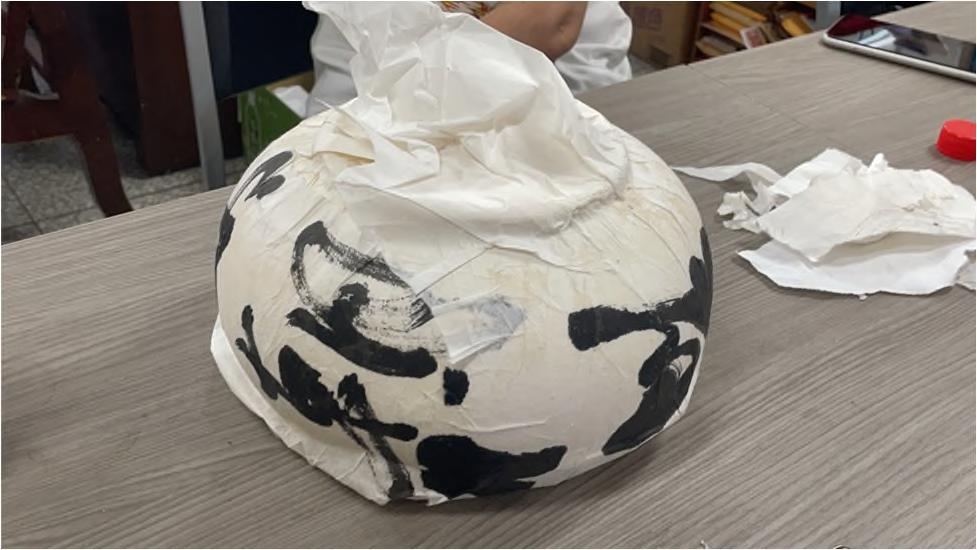 將樹葉抽離為纖維的概念,以志工家中大量書畫練習廢紙及購買太 多的宣紙進行創作。透過裱畫技巧製作器皿,文字也讓器皿令人有 更多的省思。