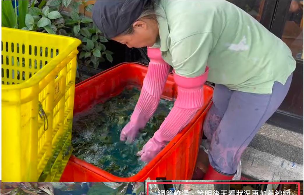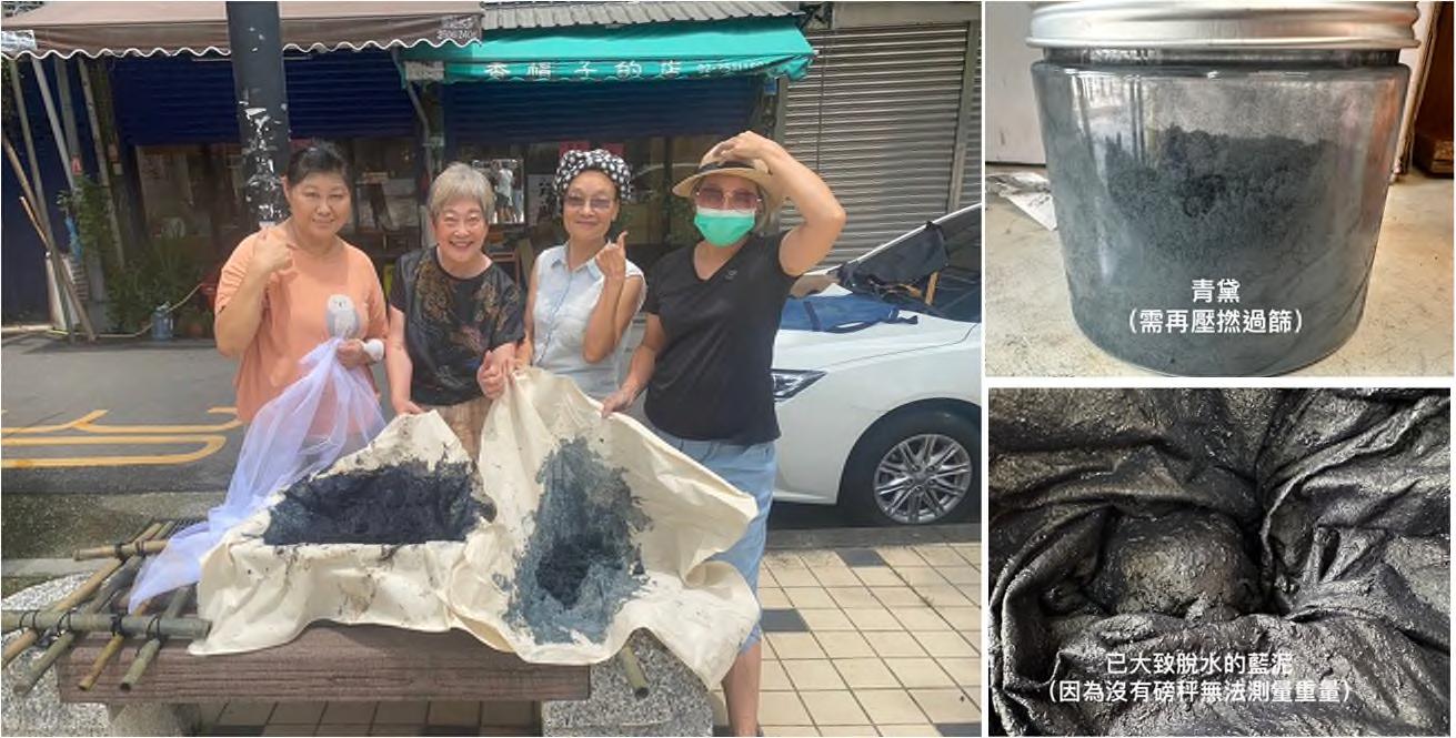 藍開始溶出來囉~早上六點翻⼀次、有青綠⾊出現、還有點油脂浮在上 面。收青黛!去雜水,曬青黛。感謝心香的騎樓,給了大家很多方便