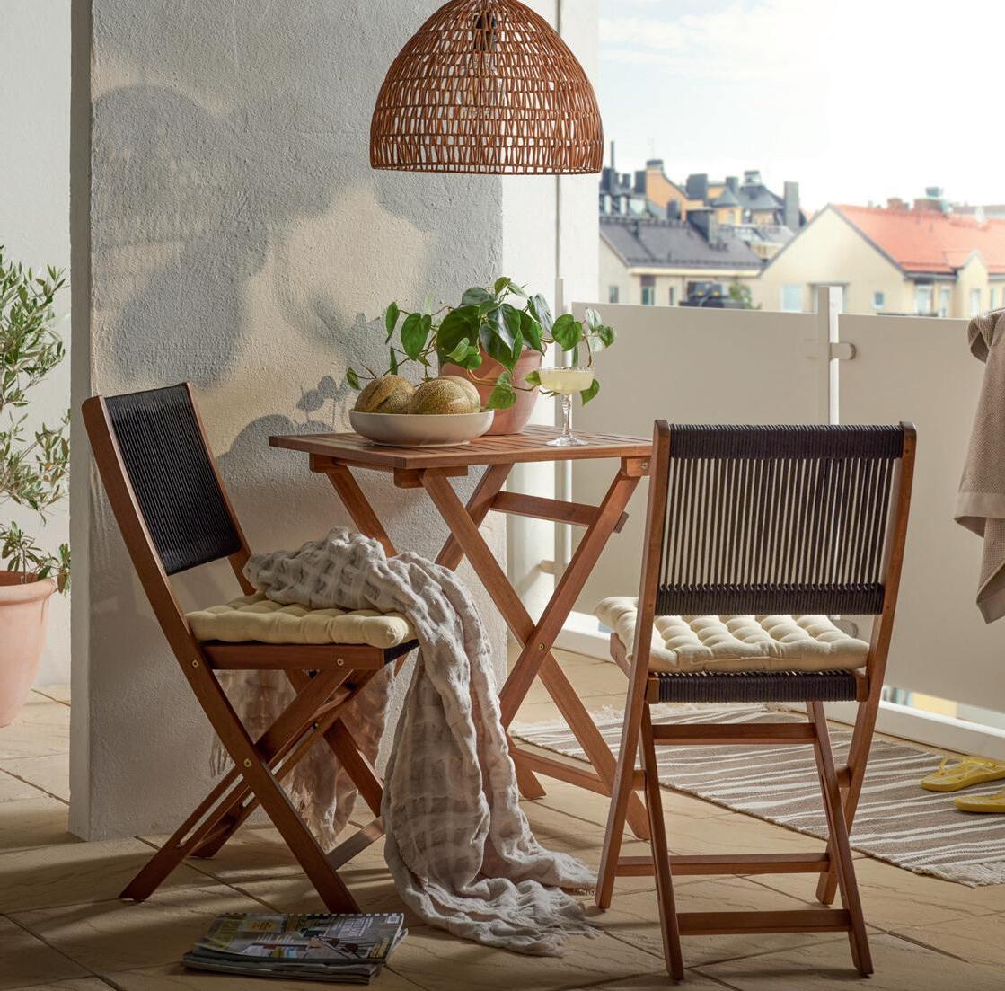 Skapa avkoppling med ett lättskött utebord och stapelbara konstrottingfåtöljer. Både stil och komfort för altanen, balkongen eller uterummet!