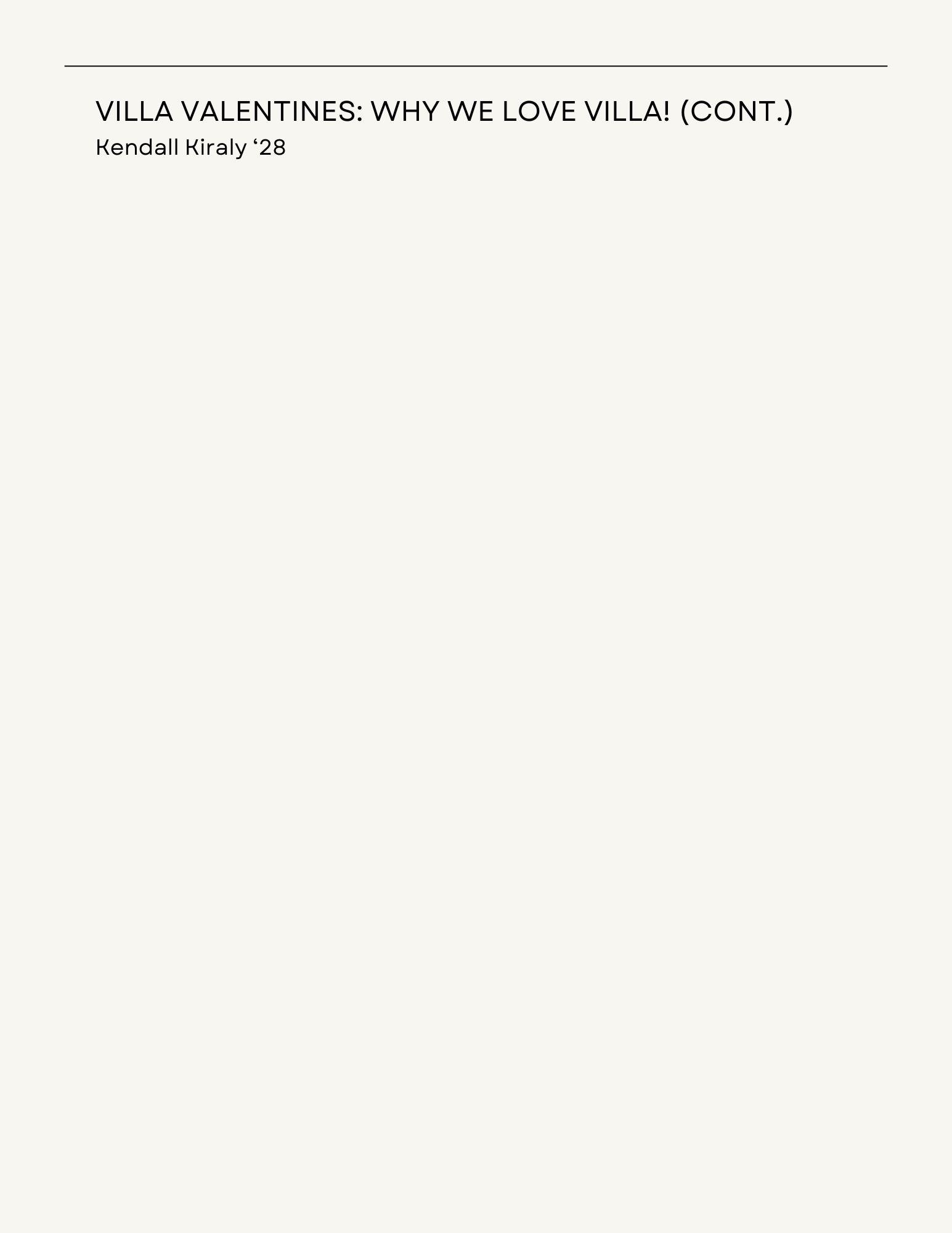 Over the past six years, Villa has iven me more thanIcouldhaveima ined:it avemesomeo myclosest riendships and memories I will always cherish. Dressin Cloda h Bateson ’26 as a carrot or Spirit Week in honor o her in er hair, lau hin as we attempted uncoordinated jumpin jacks on Goo le Meet durin COVID-19, divin into animated discussions in Dr. Lemke’s class, and playin Jeopardy every Friday in AP World History o er only a limpse into the countless moments that have defined my un or ettable experience in this sisterhood.