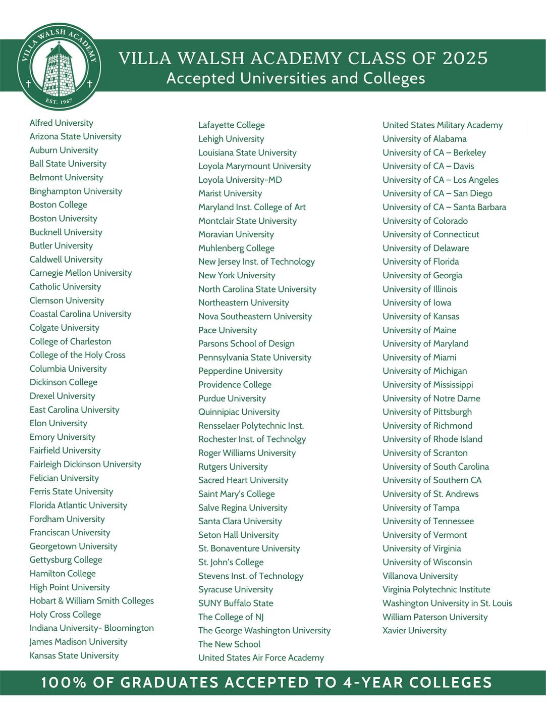 YourpersonaljourneysarecentraltowhatmakesVillaWalshAcademyso special.Whetheryougraduatedrecentlyordecadesago,youarepartofa livinglegacythatcontinuestoinspireourstudents,strengthenourmission,and guideourfuture.