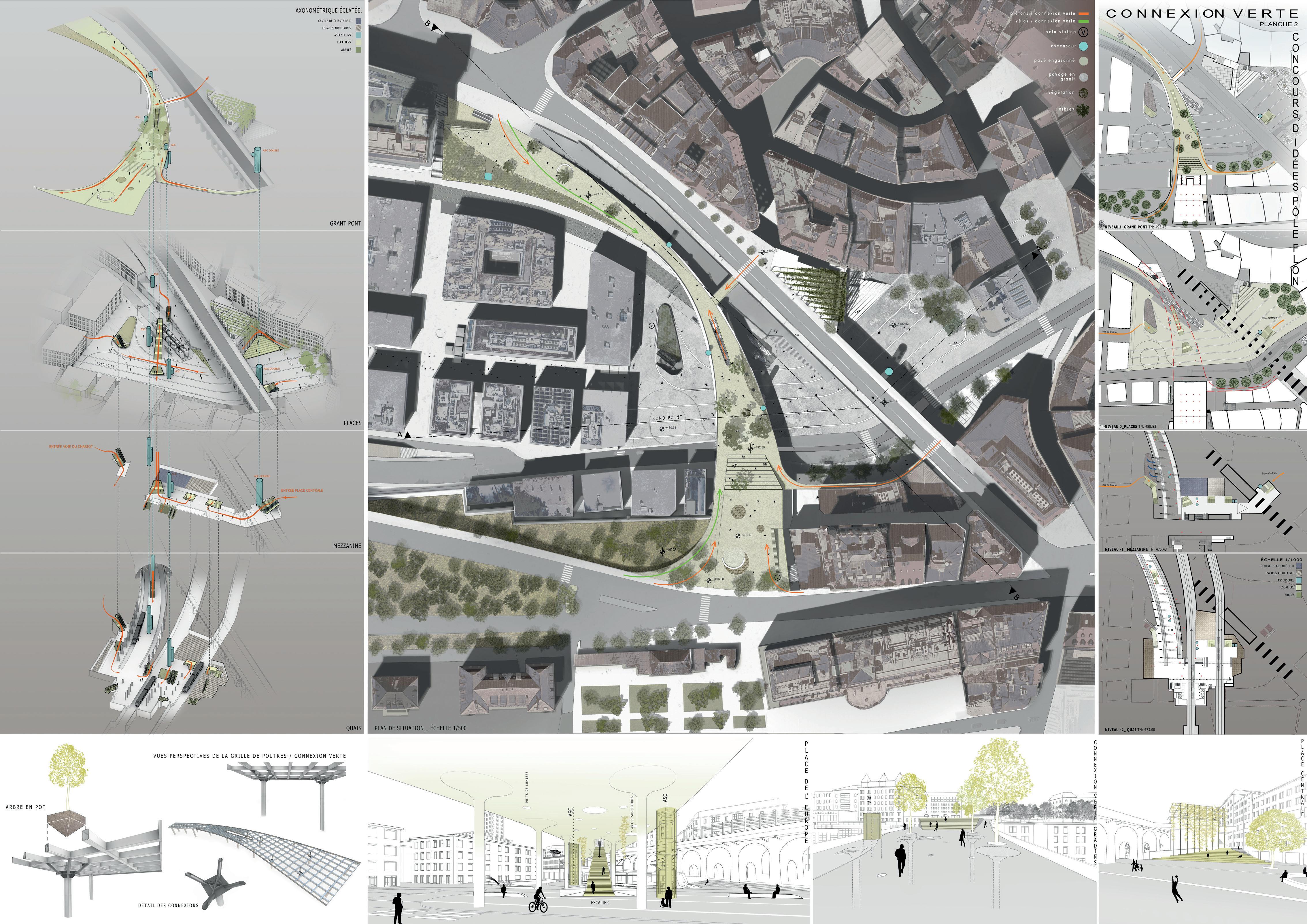 Les auteur.e.s du projet proposent un système de plateformes de parcs publics aériennes, végétalisées et pensées au niveau de la passerelle piétonne et du Grand-Pont. Cette végétalisation doit permettre de répondre aux enjeux importants d’îlot de chaleur du centre-ville. Le projet offre un circuit suspendu qui permet aux piétons de déambuler entre les plateformes. Au niveau des places et de la rue Centrale, la mobilité douce est priorisée et le stationnement est supprimé.