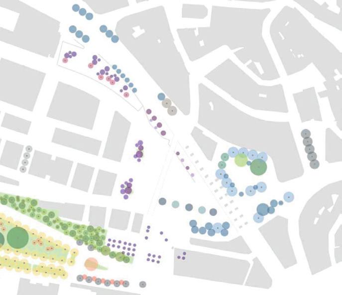 La part belle est faite aux plantations avec celles autour du cœur vert qui se poursuivent et marquent le tracé du Flon. Cela permettra de ramener une biodiversité au cœur de la ville et formera un rempart contre les vagues de chaleur.