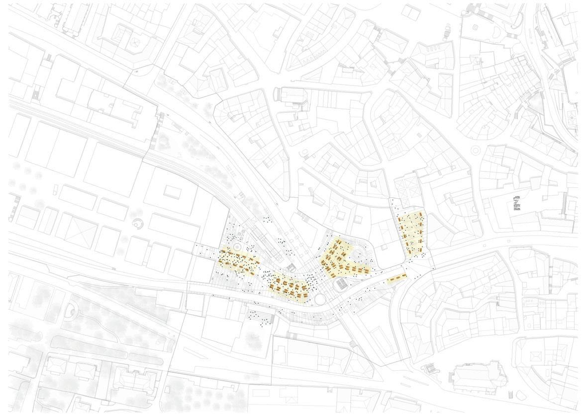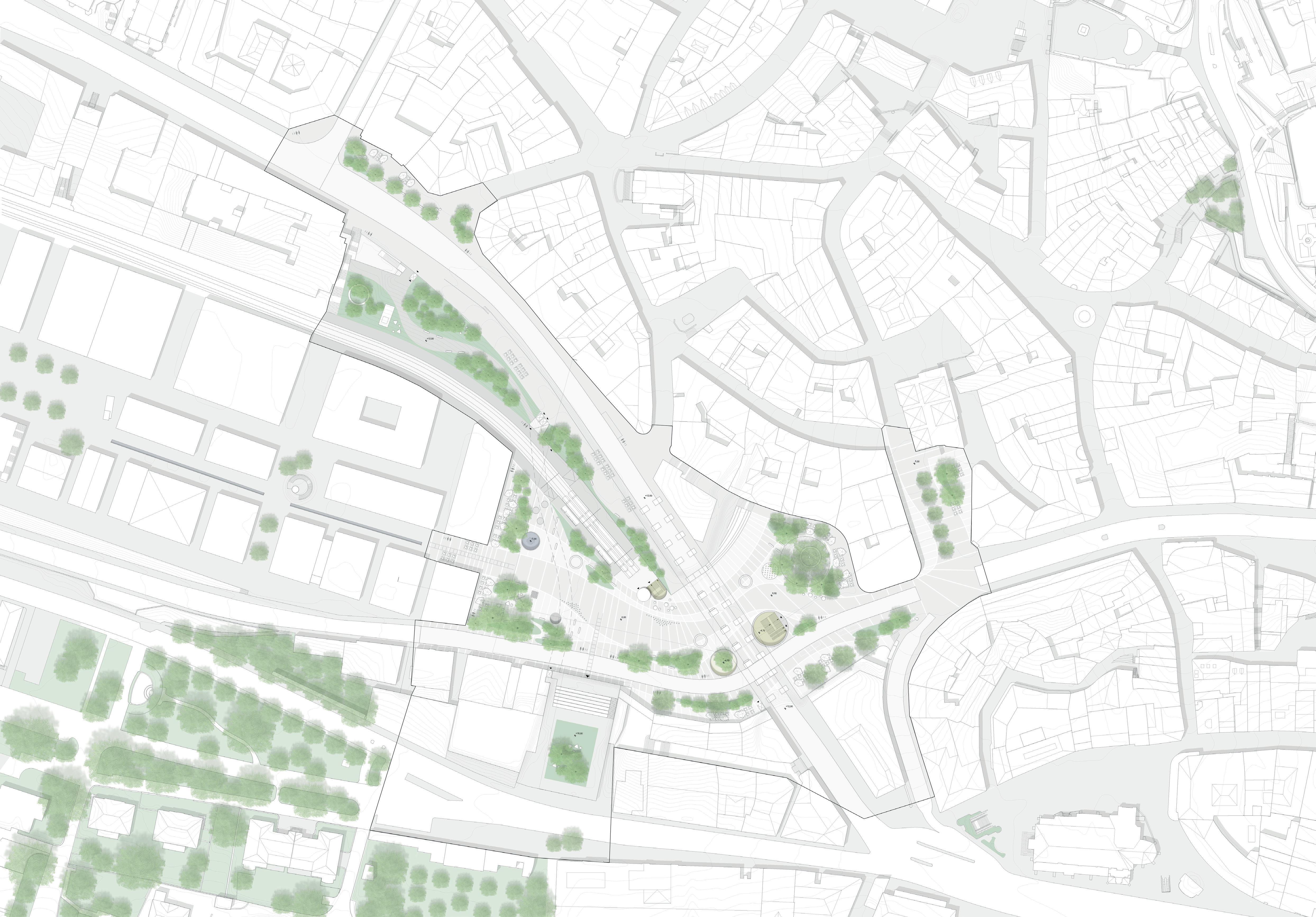 Au niveau des places, l’espace est rendu disponible pour les flux, notamment par la suppression du bâtiment du tl et une unité est recherchée grâce à un pavage partagé entre les places. La mobilité motorisée est conservée au sud du site, tandis que la place est piétonnisée.