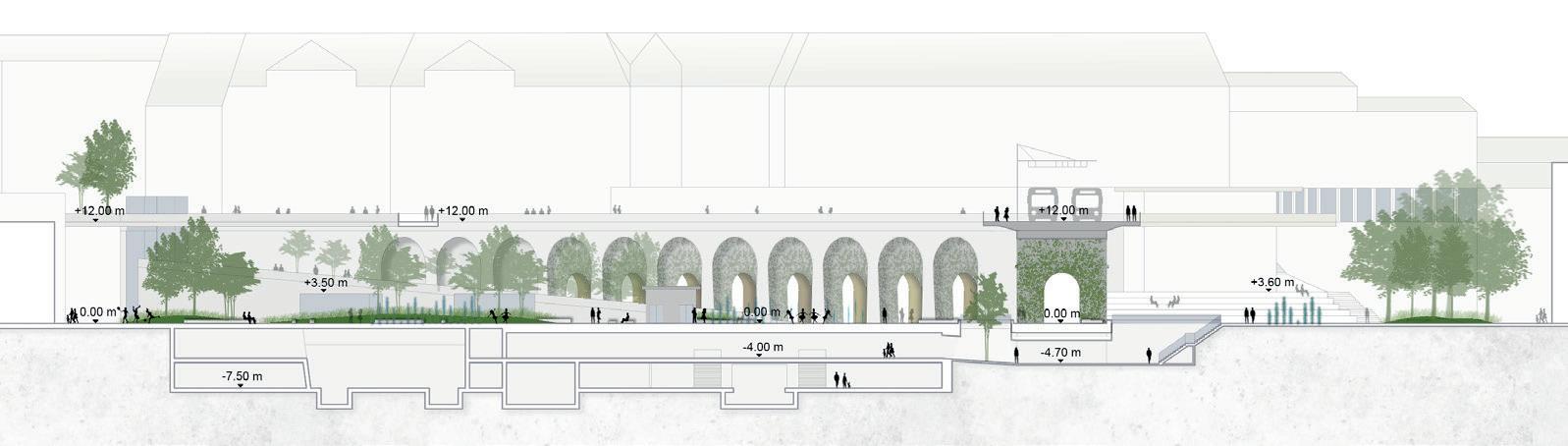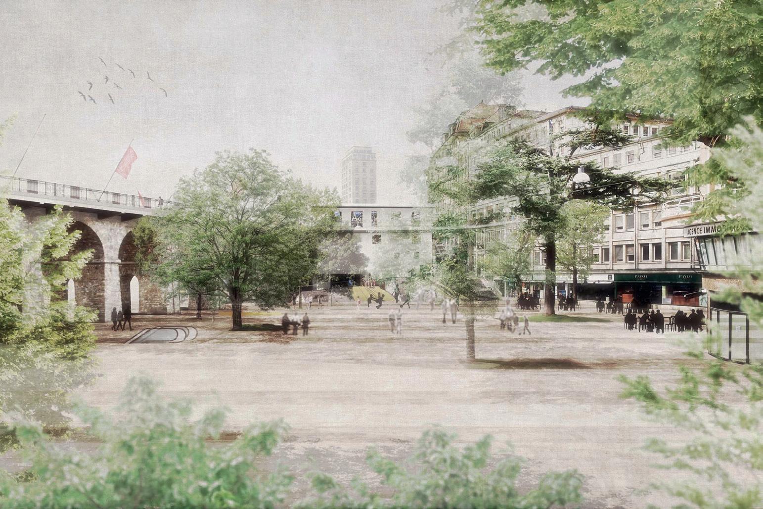Les auteur·e·s du projet proposent un système de différents plateaux de connexion et prévoient de remettre à ciel ouvert la rivière du Flon ainsi que le second niveau d’arches du Grand-Pont.