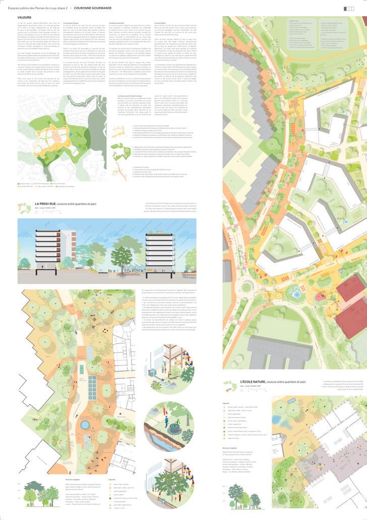 L’ensemble des thématiques est finement détaillé dans une série de schémas qui démontrent la prise en compte des enjeux de l’aménagement de ces espaces publics. En particulier, la vocation des différents espaces, la nature des sols, la gestion de l’eau, la diversité des milieux et les compléments d’arborisation donnent à voir un projet qui répond globalement au cahier des charges du concours.