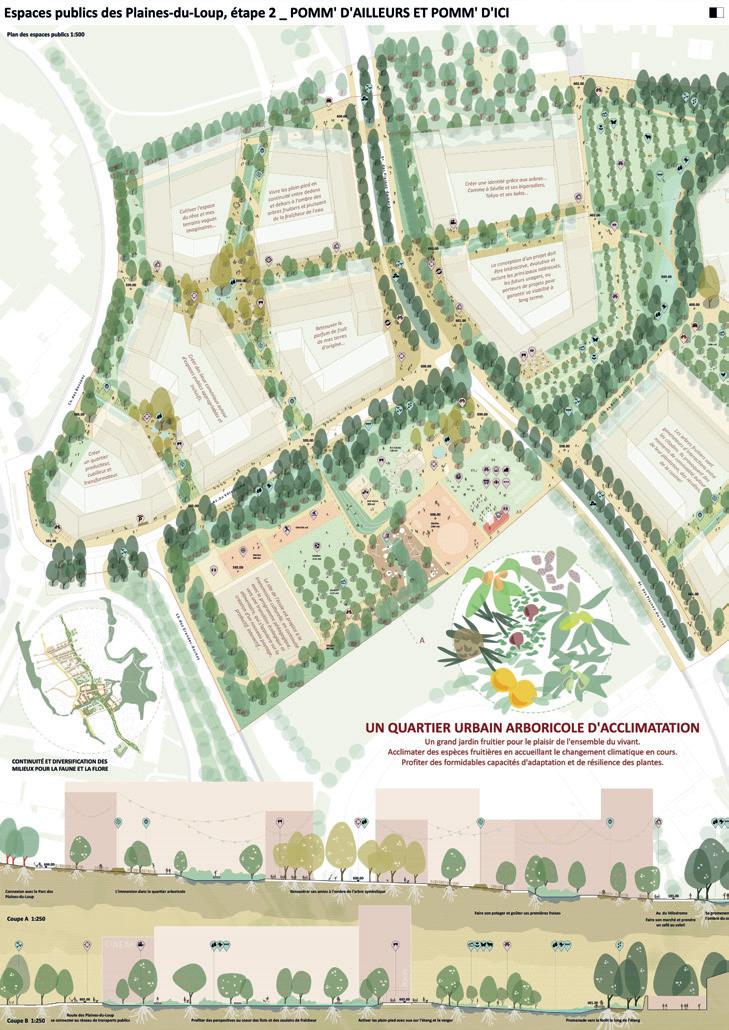 Dès le premier tour, le projet POMM' D'AILLEURS ET POMM' D'ICI propose de structurer le futur quartier principalement avec l’arborisation, en utilisant au maximum la figure de l’arbre fruitier, sauvage et de production. Celui-ci prend différentes formes : plantations équidistantes comme dans un verger de production, alignées le long des voies, ou de manière plus libre sous la forme d’un grand cordon boisé traversant le site d’est en ouest, qui intègre la prison de Bois-Mermet. Les axes de mobilité comme la route des Plainesdu-Loup sont insérés dans ce système, tout en conservant leur fonctionnalité d’artère de mobilités mixtes. Différents lieux d’usages, dont le parc du Vélodrome, sont proposés dans cette trame, équipements de jeux, mobilier, promenades, ainsi que des jardins potagers. Certaines rues, parallèles à la pente, sont équipées de noues d’infiltration des eaux à ciel ouvert. L’ensemble de ces dispositifs, mêlant nouvelles plantations ou venant densifier l’existant, est composé de variétés de production fruitière classique, sous la forme de vergers haute-tige et mi-tige, de fruitiers sauvages, de haies. Le projet entend donner une forte dimension comestible, productive et fertile à l’ensemble des espaces publics.