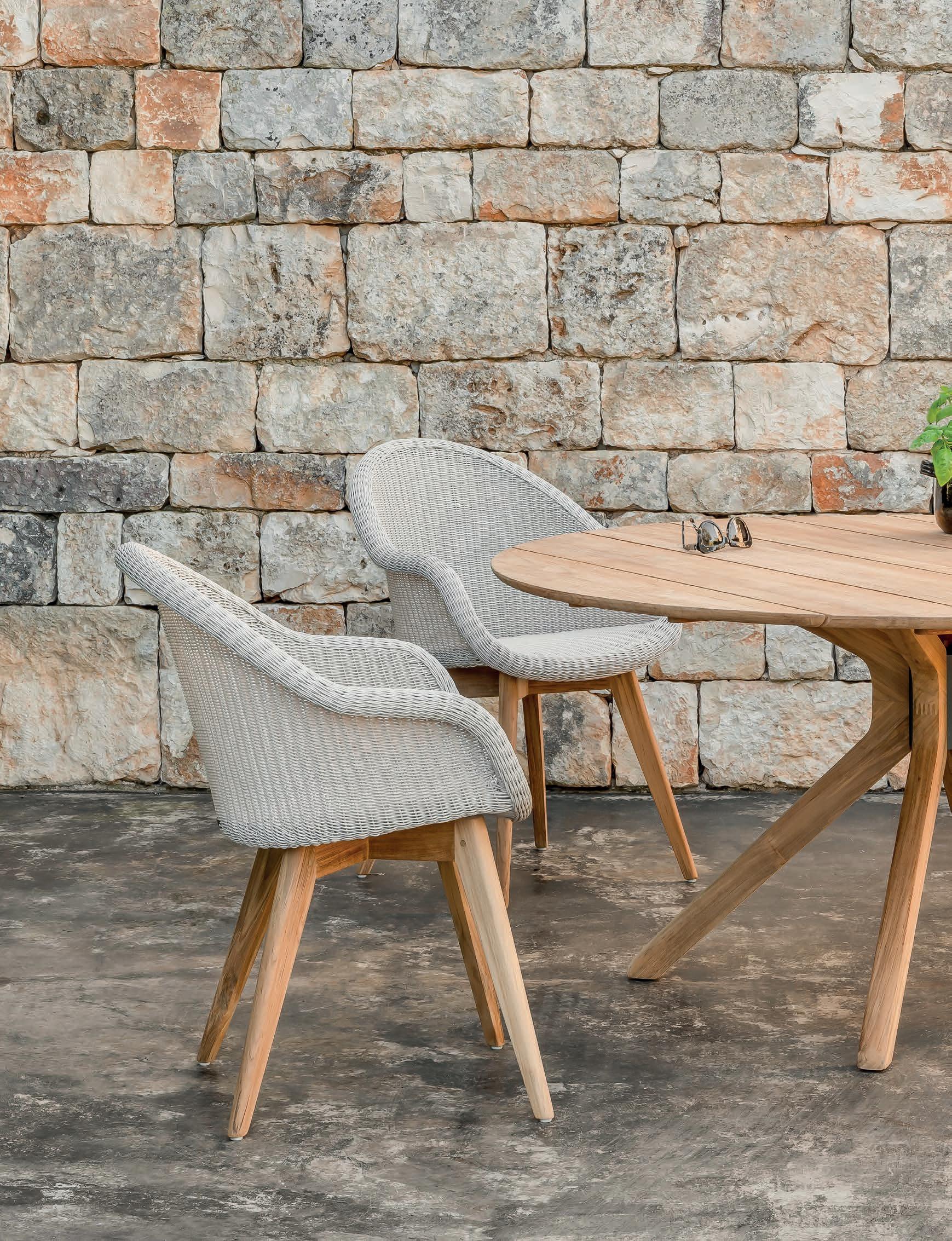 For our all-weather outdoor collection, we use multiple synthetic materials, including polyethylene, polypropylene, and HDPE wicker. All our synthetic materials are specifically designed to withstand any weather conditions, are UVresistant, and can be left outside all year long. We recommend giving them a quick wash when dirty or every three months with a non-foaming mild detergent.