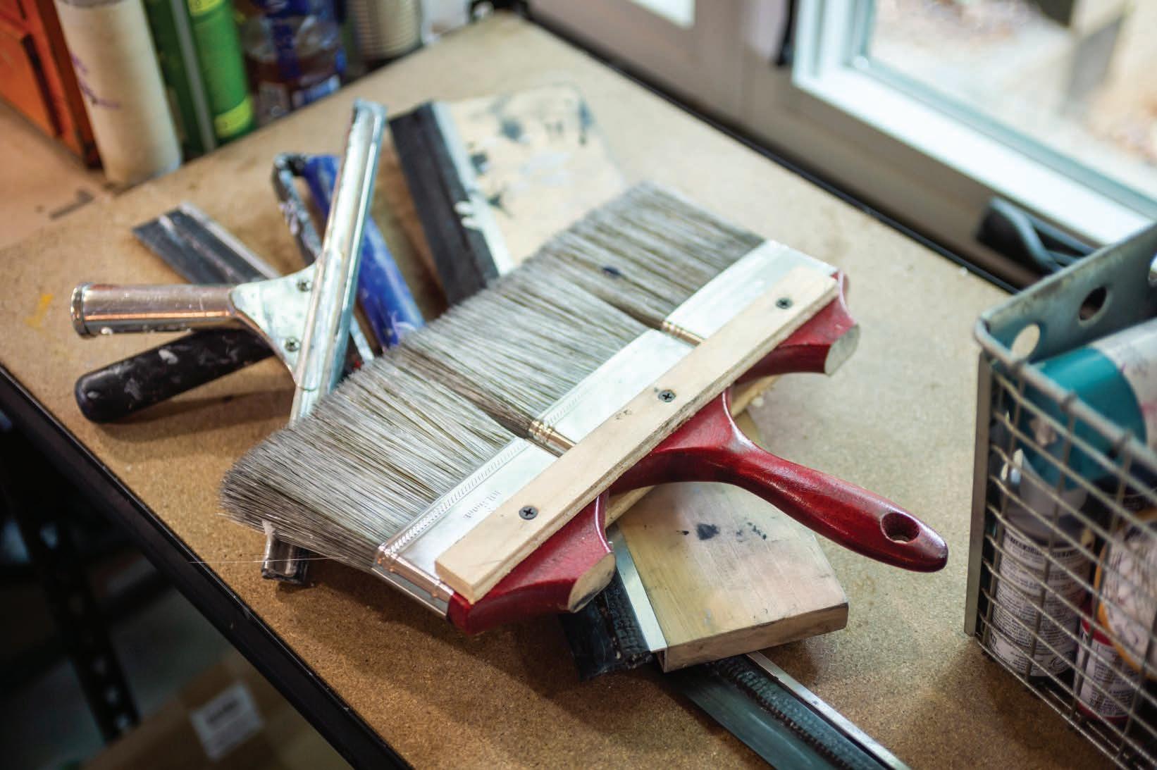 But even if the beauty of a flower (or a painting) is obvious, there is still much going on beneath the surface, a fact evinced by Walker’s basement studio. His workplace is a crucible of creativity: precise, functional and stylish. A thick metal support pole, jutting through the center of the space, is peppered with magnetized pencils and brushes.