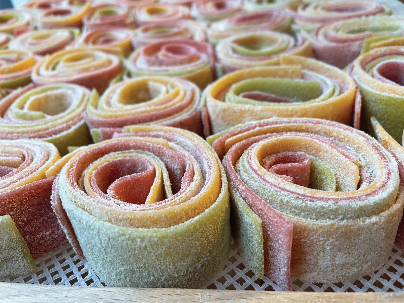 Because Katie oversees every aspect of pasta production, she has the opportunity to add even more creative touches throughout. Her “garden party” pasta is dyed with spinach, red bell pepper and beets to create green, orange and pink noodles.