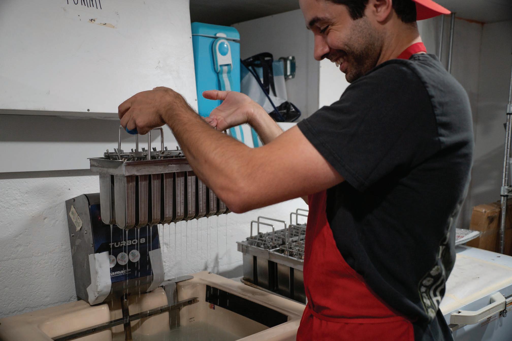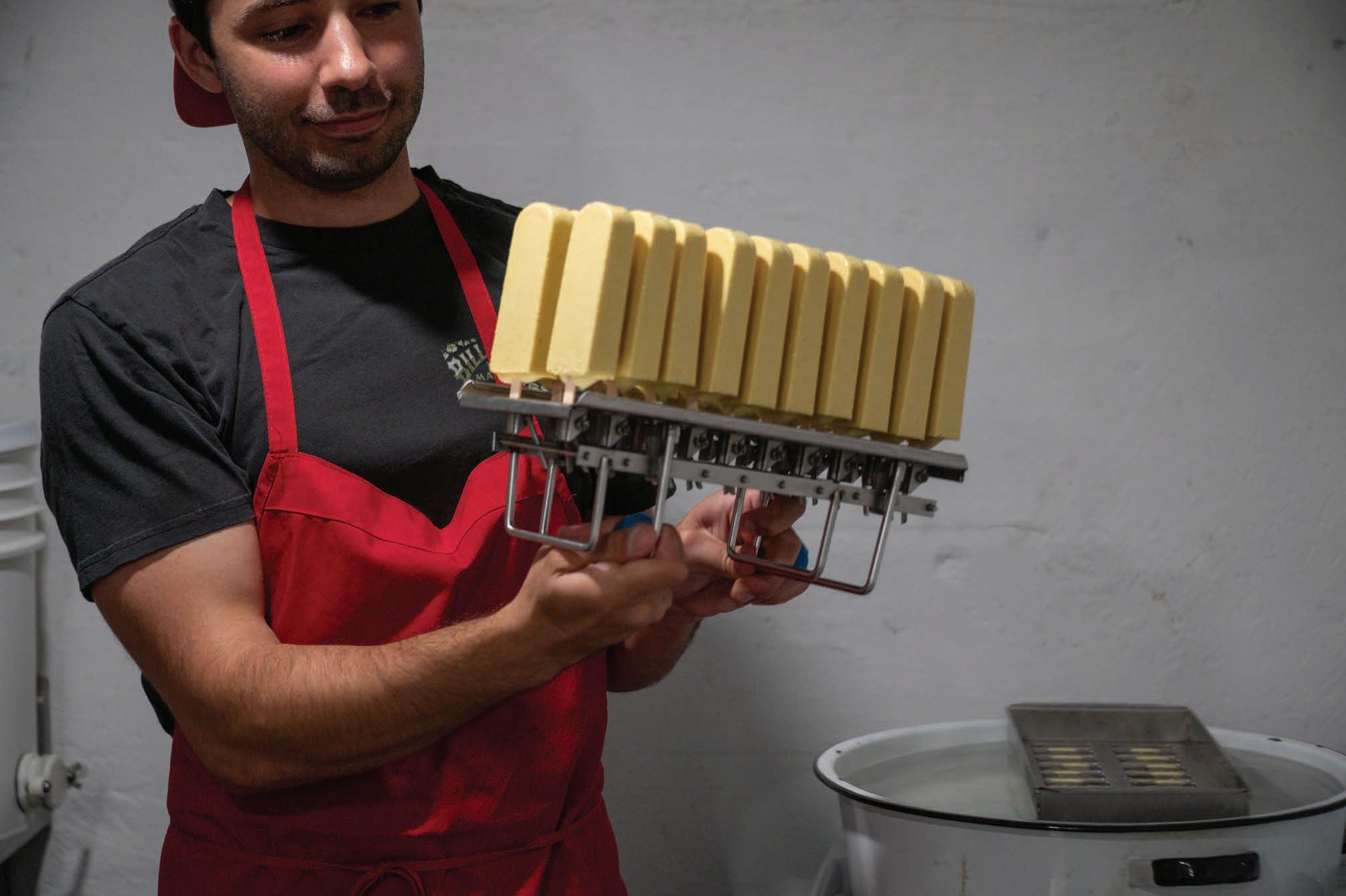 milk base that’s mixed with spices. The mixes are then poured into molds, which are quickly dipped into a glycol bath before being frozen at -27 Celsius. Each batch yields 60 bars. The duo works six days a week in production in addition to making the rounds of the farmers’ markets, the Chilmark Flea, the Edgartown Village Market and onIsland retail vendors.
