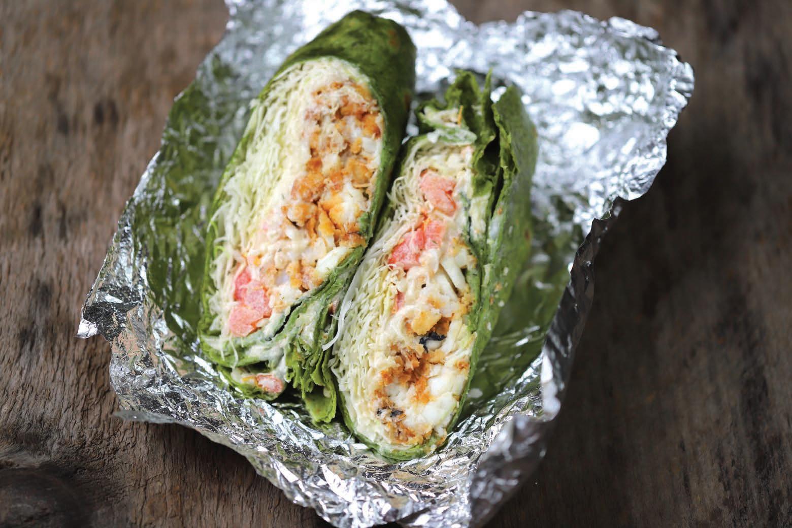 One of Sandy’s most popular lunch items (and mine, too), the fish wrap contains strips of breaded fresh white fish mounded on thinly sliced cabbage, topped with a Greek yogurt sauce, pico de gallo and Cheddar or Jack cheese, all wrapped in a plain, wheat or spinach wrap. Though it feels light, it’s a large portion and very filling.