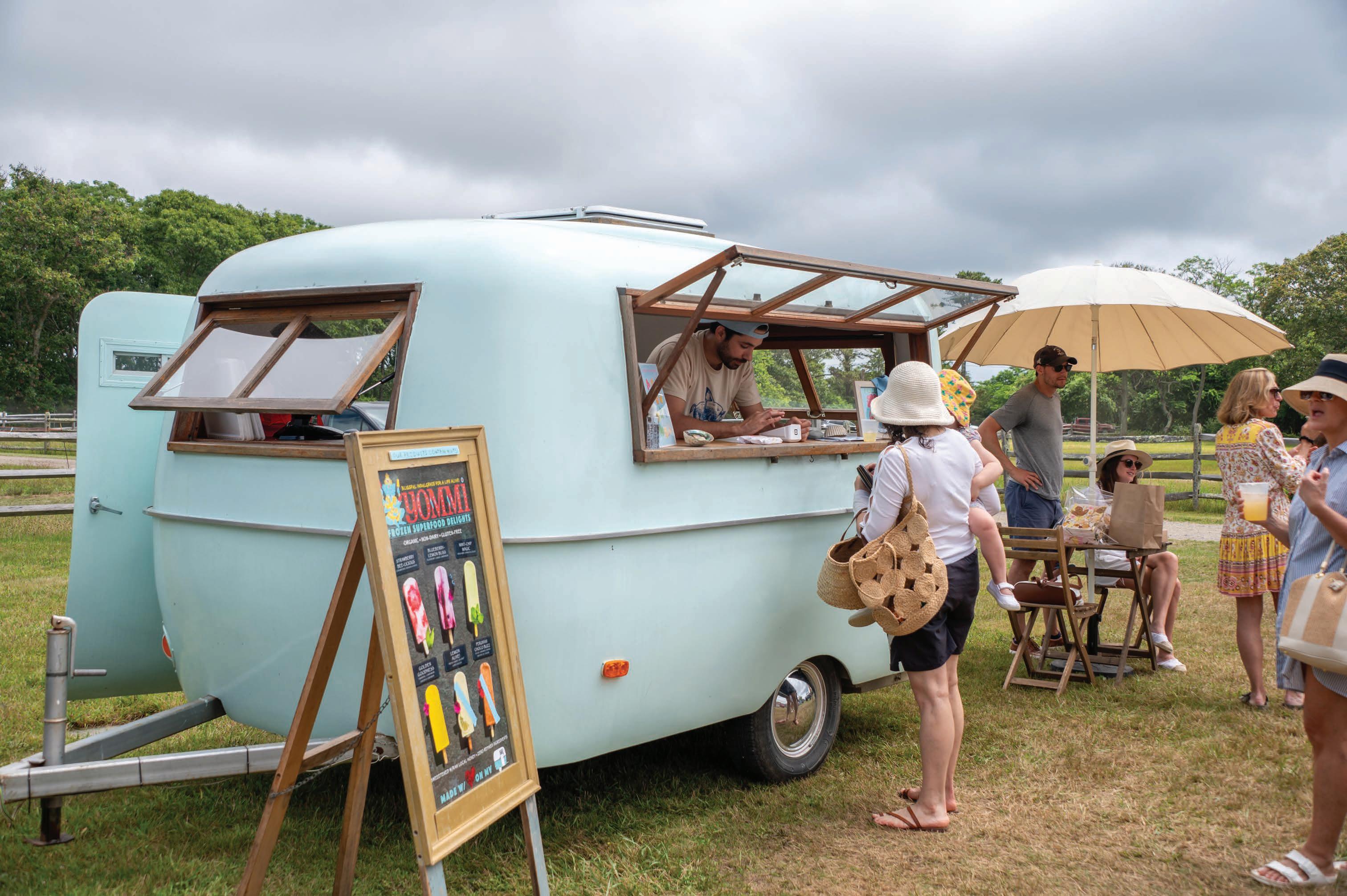 In October 2022, Caroline and Ryan bought Yommi from Nicole Corbo and Adrian Johnson, the Island couple who spent seven years developing recipes for the six frozen bar flavors and establishing the brand’s visibility. Yommi’s presence at the West Tisbury Farmers’ Market is unforgettable: the blue vintage 1972 Boler camper that doubles as a sales kiosk is a draw and