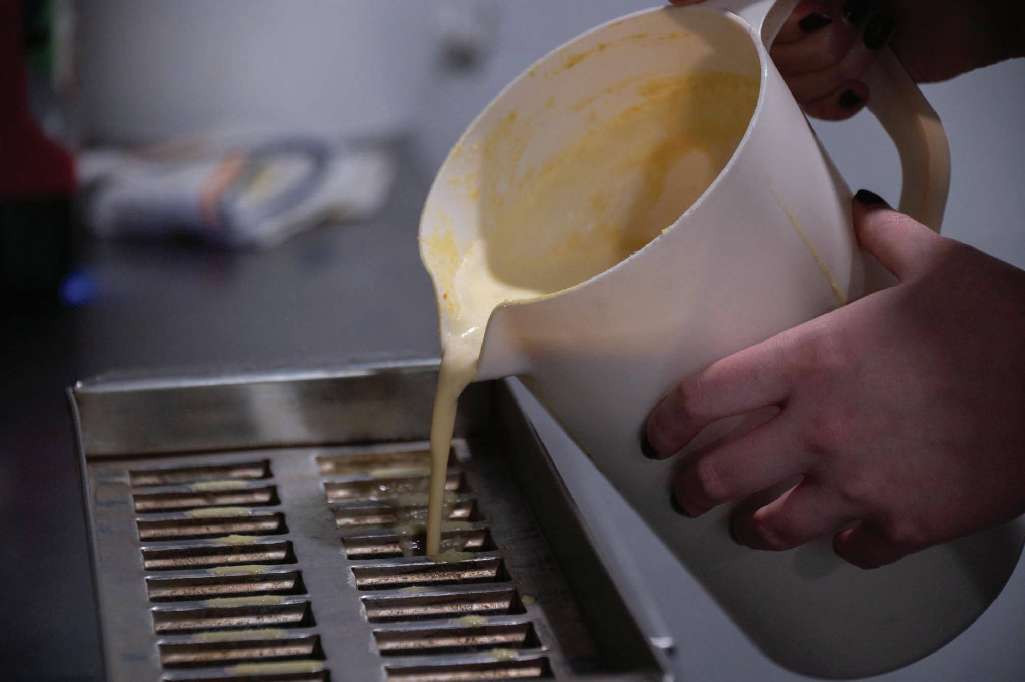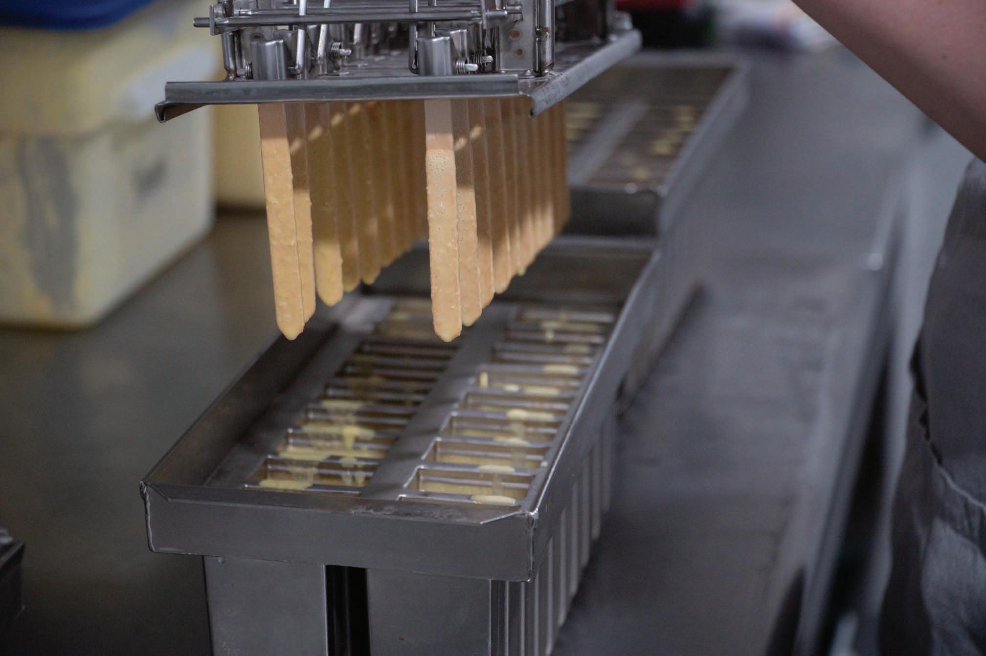 “It looks like a tie-dyed T-shirt,” Caroline exclaims on seeing a fresh bar pulled from the freezer.