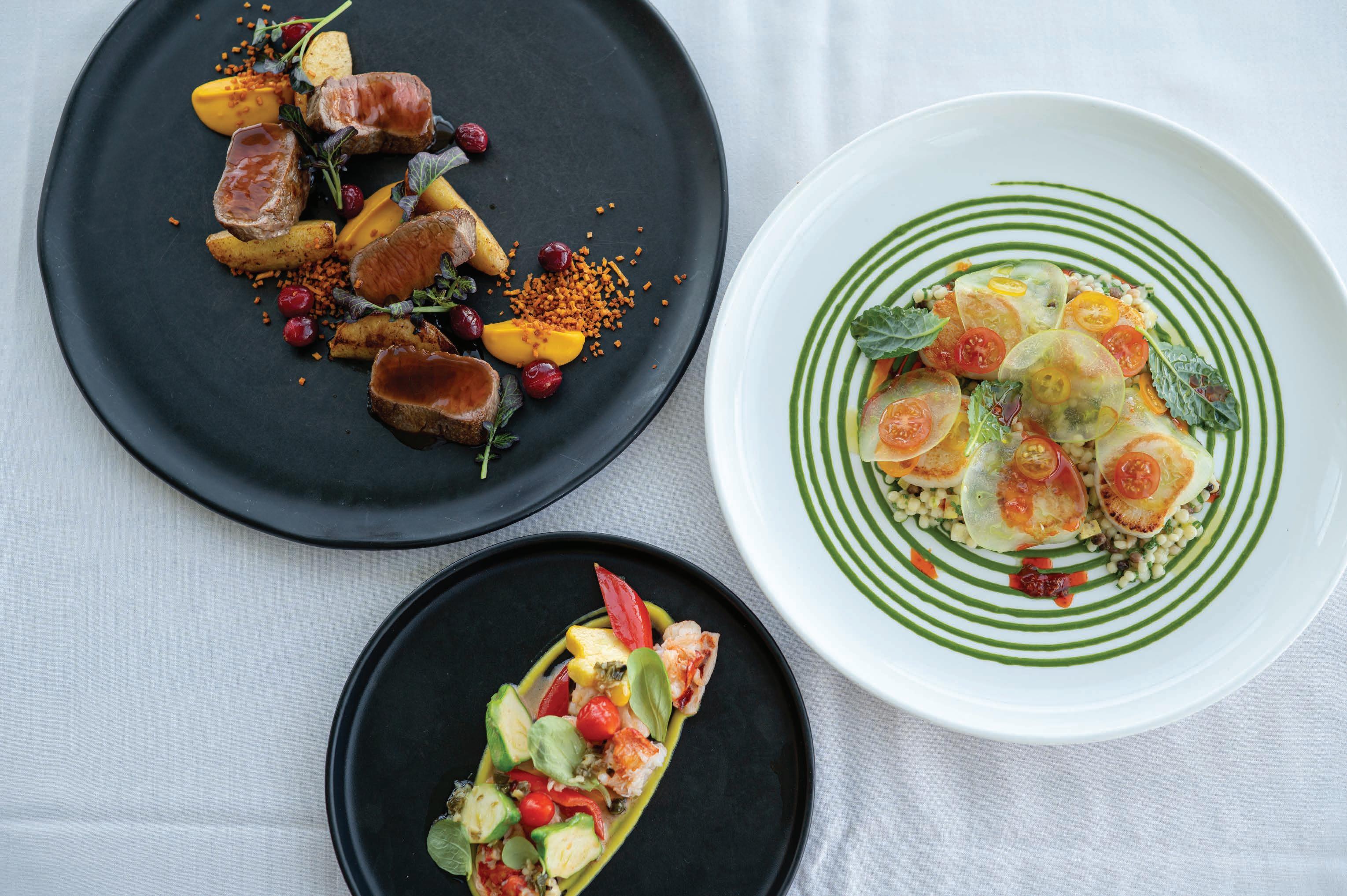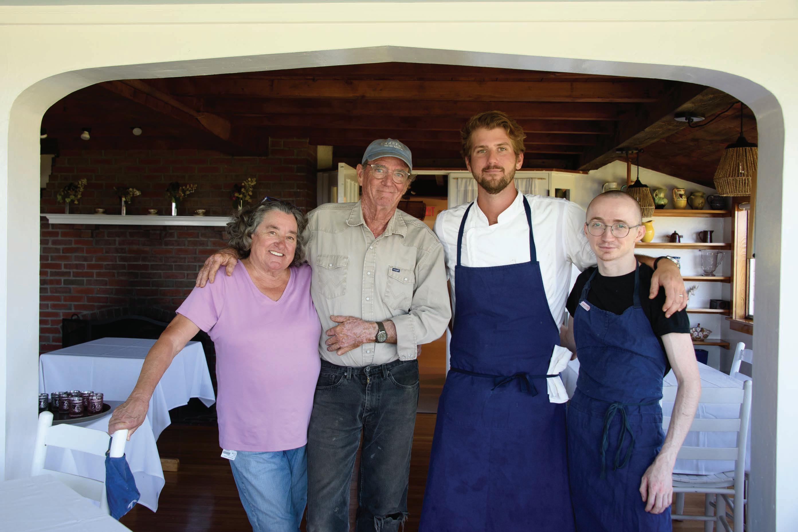TOP: Outermost's late summer dishes (above) incorporate fall flavors and ingredients into dishes starring venison, lobster and sea scallops. BOTTOM, LEFT TO RIGHT: Outermost Inn owners Jeanne and Hugh Taylor with executive chef Scott Grewe and sous chef Con nor Murtagh.